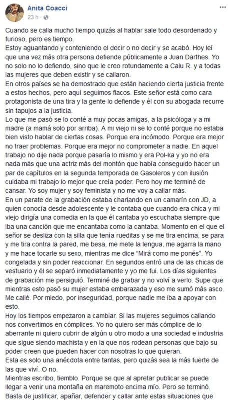 Fue desde su cuenta de Facebook que la actriz y cantante relató cómo había sido abordada por Darthés. “…El señor se desliza con la silla que tenía rueditas y se me tira encima, se para y me tira contra la pared, me besa, me mete la lengua, me agarra la mano y me hace tocarle su sexo, mientras me dice `Mirá como me ponés´. Yo congelada y sin poder reaccionar…”, contó entre otras cosas.