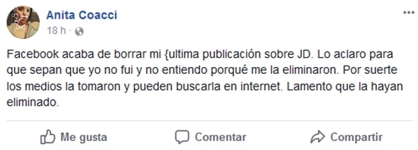 Y horas más tarde y luego de que el tema se haya instalado en todos los medios, llegó otra denuncia de Anita: “Facebook acaba de borrar mi última publicación sobre JD. Lo aclaro para que sepan que yo no fui y no entiendo por qué me la eliminaron. Por suerte los medios la tomaron y pueden buscarla en internet. Lamento que la hayan eliminado”, posteó. ¿Qué habrá pasado?