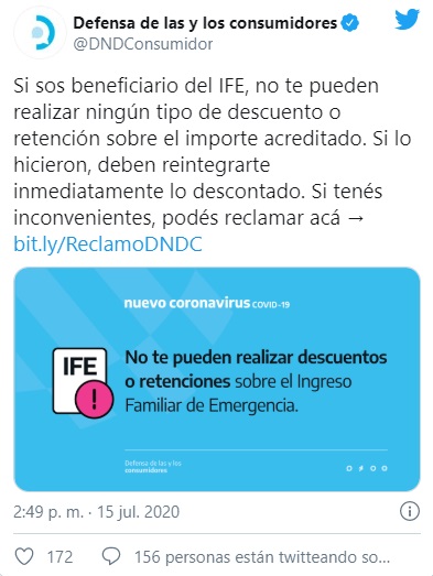 “Si sos beneficiario del IFE y te hicieron algún tipo de descuento o retención sobre el importe acreditado, deben reintegrarlo inmediatamente”, informó organismo al tiempo que dejó la página web para que los usuarios afectados puedan realizar el reclamo y así lograr un reintegro del dinero: “Podés realizar tu reclamo ingresando a http://bit.ly/ReclamoDNDC”.