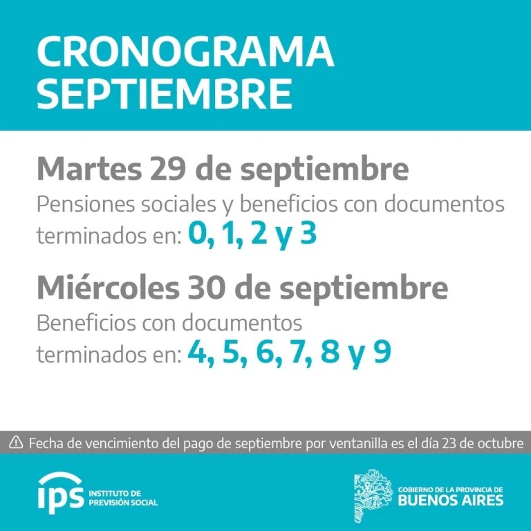 No obstante, el Instituto de Previsión Social de la provincia de Buenos Aires informó que este martes 29 de septiembre se abonarán las pensiones sociales a los beneficiarios con documentos terminados en cero, uno, dos y tres, mientras que el miércoles 30 cobrará el resto.
