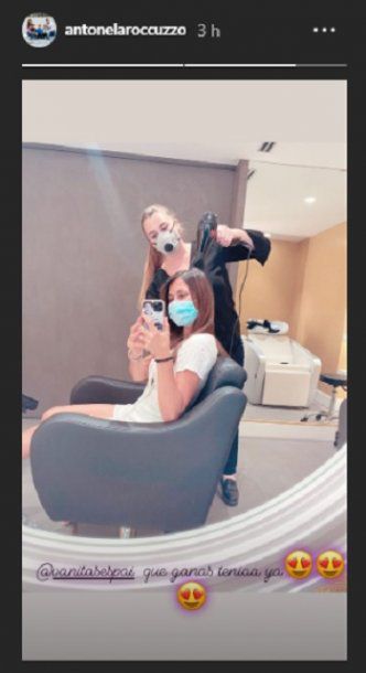 Con barbijo y cumpliendo el protocolo sanitario, Antonela pasó por la peluquería en Barcelona, donde reside con el ídolo del fútbol mundial y sus hijos. Junto a la imagen que subió en su historia de Instagram en que se la ve en un salón vacío junto a la peluquera, también con barbijo, escribió: “Qué ganas tenía ya”.