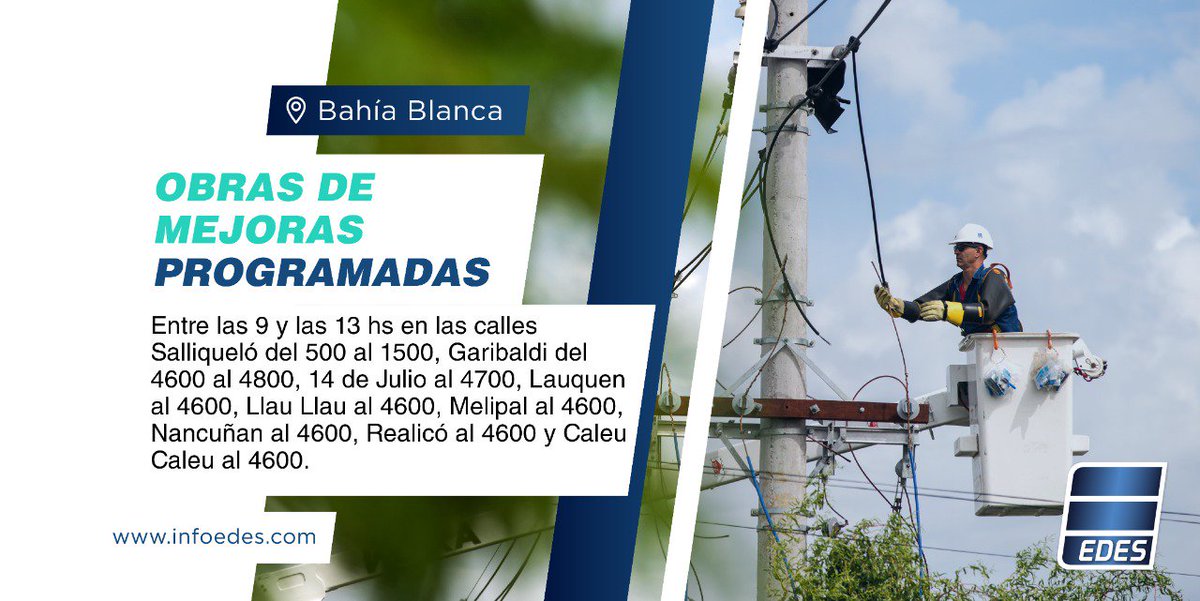 La empresa EDES anunció varios cortes de energía para este miércoles en Bahía Blanca e Ingeniero White, por tareas de mejoras y mantenimiento.
