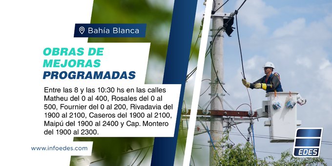 La empresa EDES anunció dos cortes de energía para este lunes en la ciudad, por tareas de mejoras y mantenimiento.