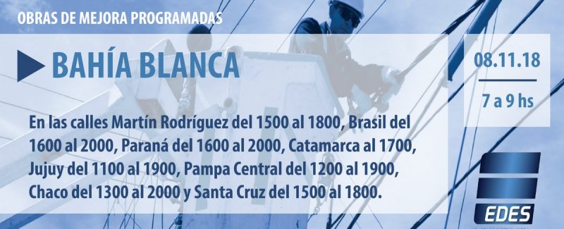 La empresa EDES anunció dos cortes de energía para el jueves 8 de noviembre en la ciudad, por tareas de mantenimiento y mejoras.