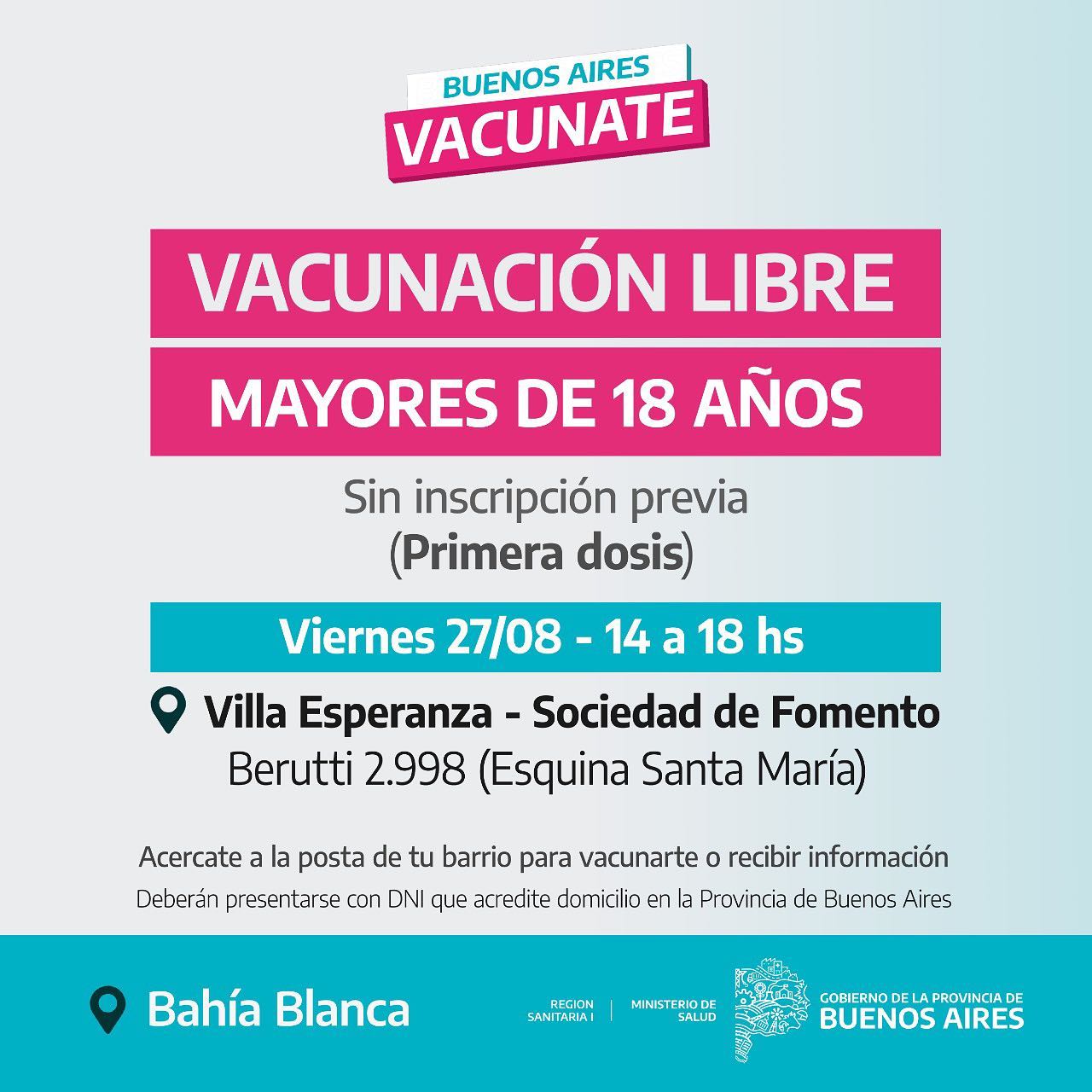 Mañana (viernes 27), de 14 a 18, se realizará un fuerte operativo de inmunización contra el covid-19 en la sociedad de fomento de Villa Esperanza, en Berutti 2998, y en los hogares de la zona.