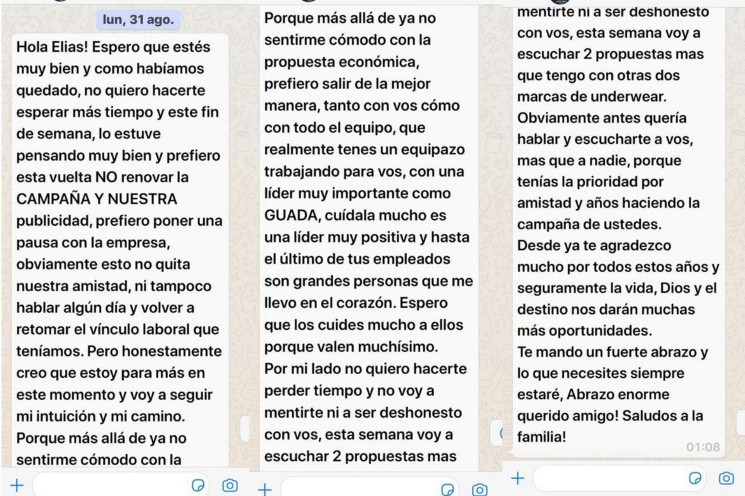 Las palabras exactas que se leen en las capturas publicadas por Clarin fueron: “Lo estuve pensando muy bien y prefiero esta vuelta no renovar la campaña y nuestra publicidad, prefiero poner una pausa con la empresa. Te agradezco mucho por todos estos años“.