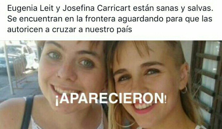 Una amiga de la familia de una de las mochileras confirmó la aparición de las chicas en su Facebook: “Hola amigos queridos. Recién me contaron que las chicas de Pergamino aparecieron y están bien. MIL GRACIAS A TODOS LOS QUE AYUDARON COMPARTIENDO EL MENSAJE!!!! Un fuerte abrazo.”.