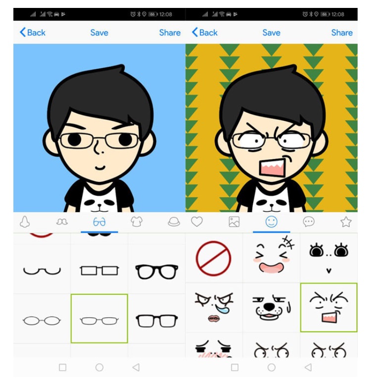 FaceQ no es tan complejo como las aplicaciones anteriores, pero después de crear tu avatar podés elegir entre distintas expresiones y trajes listos para usar. En cualquier momento puedes grabar la imagen en el celular o compartirla con otras apps.