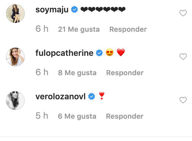 Sus mejores amigas famosas, conmovidas ante el mensaje de la actriz, le demostraron su apoyo a través de emojis. Maju Lozano le comentó la publicación con un montón de emojis de corazones negros. En la misma línea, Catherine Fulop con un corazón rojo y el emoji que simula estar enamorado. Y Verónica Lozano también le dedicó un corazoncito rojo.