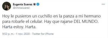 Hoy le pusieron un cuchillo en la panza a mi hermano para robarle el celular. Hay que rajarse del mundo. Harta estoy. Harta“, expresó la China Suárez en Twitter el domingo a la noche, luego de arribar desde Chile a la Argentina. De todos modos, luego borró el mensaje.