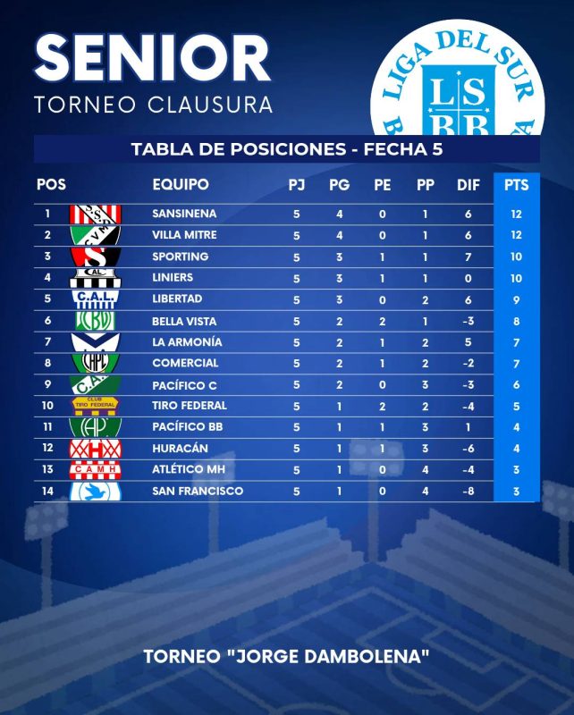 La Liga del Sur oficializó la tabla de posiciones finalizada la fecha 5 del Torneo Clausura de Fútbol Senior.