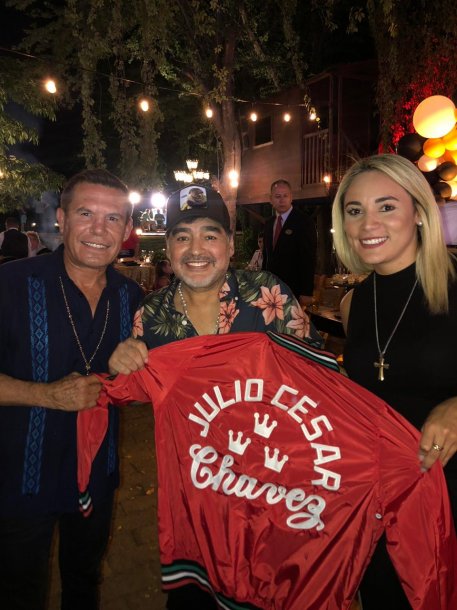 Con un particular look de bermudas y una camisa floreada de Versace, la primera de las sorpresas que recibió el 10 fue la visita del ex campeón del mundo de boxeo y uno de los más grandes de la historia, Julio César Chávez. El boxeador le regaló un par de guantes autografiados y una “chamarrita” con su nombre.