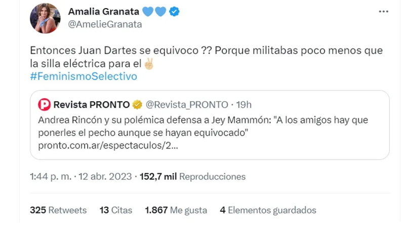 En este sentido, ante el revuelo que generó la polémica defensa de la actriz a Jey, Amalia Granata opinó del tema vía Twitter y la acusó de “feminismo selectivo”, mencionando el caso de Juan Darthés, denunciado en 2018 por Thelma Fardin por abuso sexual.