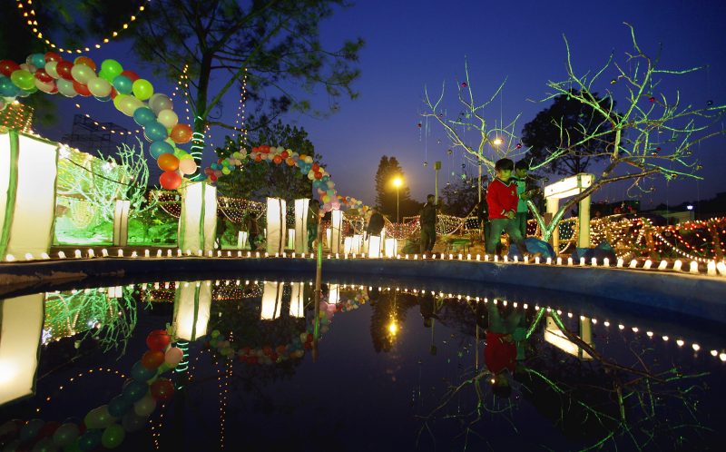 Niños pakistaníes de una comunidad cristiana en una fuente adornada con motivos navideños en Islamabad