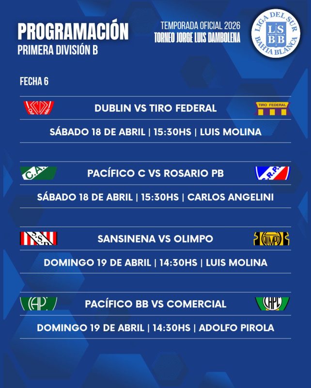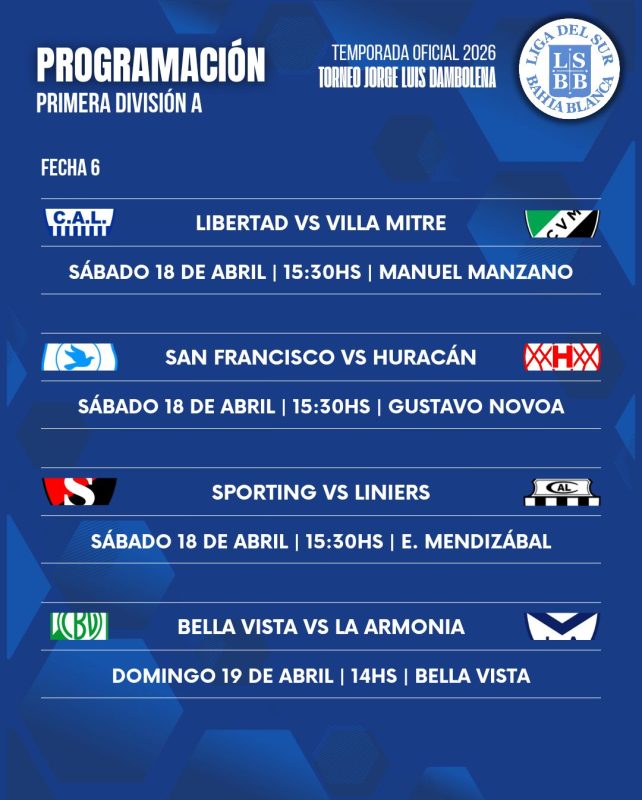 La Liga del Sur confirmó los días y horarios de los partidos de la sexta fecha del Torneo Apertura “Jorge Luis Dambolena” de Primera División.