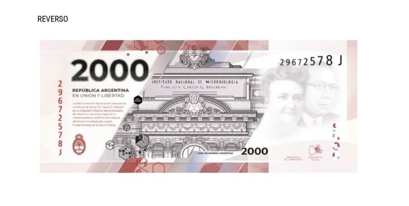 Mientras que en el reverso del billete, estará presente una imagen de la fachada del Instituto Malbrán, organismo que tiene como misión fundamental participar en las políticas científicas y técnicas vinculadas a los aspectos sanitarios del ámbito público, detalló un comunicado del BCRA.