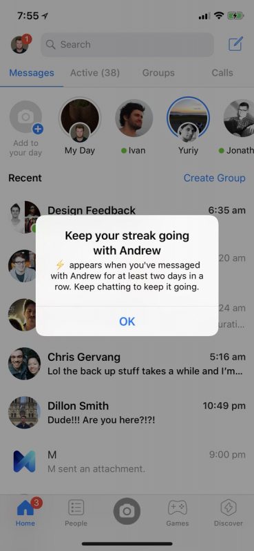 “Por ejemplo, un rayo puede aparecer cerca del nombre de la persona con la que llevas al menos tres días consecutivos intercambiando mensajes, y un contador indicará cuántos días consecutivos lleváis charlando”, declararon al portal desde Facebook la semana pasada.