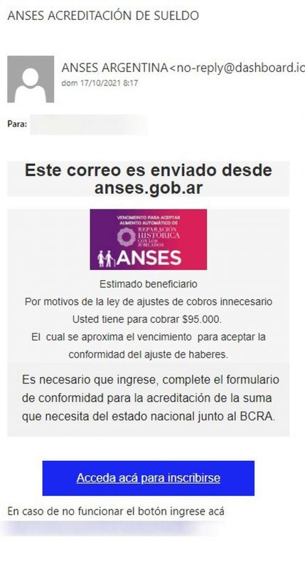 Por un lado hay que revisar la dirección del remitente. En el caso que se divulga esta semana, es posible ver a simple vista que no se trata de una comunicación oficial de ANSES, más allá de las grandes letras que indican “este correo es enviado por anses.gob.ar”. Por otra parte, es usual que este tipo de estafas llegue con textos en los que hay errores ortográficos o de tipeo; el intento de estafa al que hacemos referencia no es la excepción.