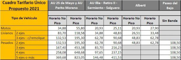 Así, por ejemplo, el peaje para un auto en las autpistas 25 de Mayo y Perito Moreno costará $83,70 en horario normal, y $118,58 en horario pico.