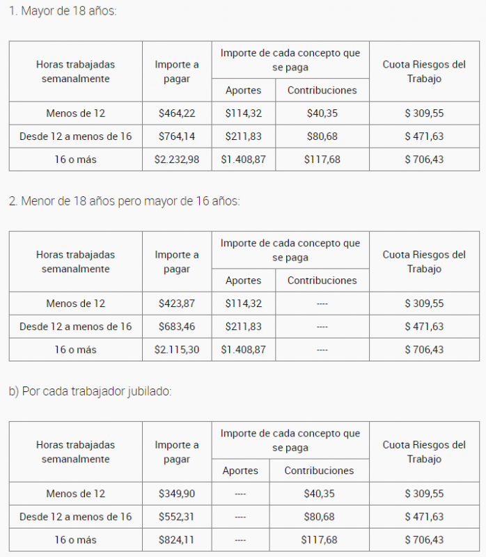 De este modo, por cada trabajador activo mayor de 18 años, el empleador deberá pagar $464,22 cuando trabaje hasta 12 horas semanales; $764,14 cuando esté en servicio hasta 16 horas, y $2.232,98 cuando cumpla funciones por más de ese tiempo.