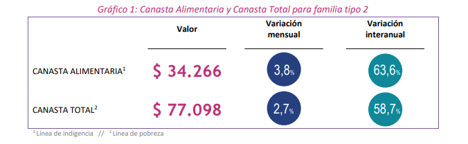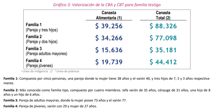 Por su parte, la Canasta Básica Total (CBT) para la misma familia alcanzó los $77.098, que son necesarios para cubrir sus consumos básicos, tanto alimentarios como no alimentarios, y así superar el umbral de pobreza.