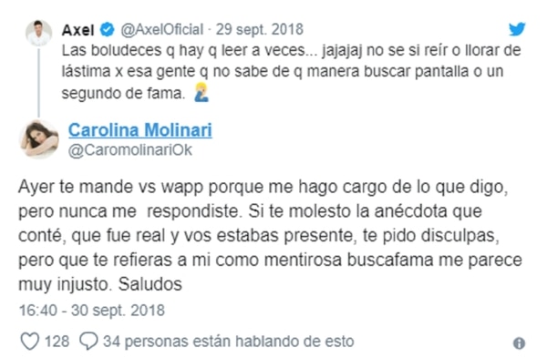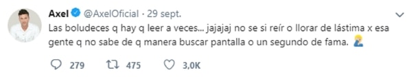 Axel, que suele tener una actitud pacífica con los medios y con sus fans, esta vez utilizó Twitter para hacer un duro descargo. El motivo tiene que ver con las declaraciones recientes de Carolina Molinari, que lo acusó de haberla bajado de un videoclip por ser más alta que él.