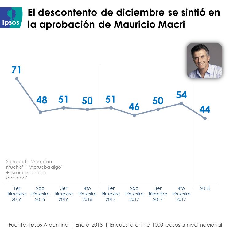 Brenda Lynch, directora de cuentas de la consultora IpsosArgentina dijo que “más allá de que Mauricio Macri tuvo un muy buen año, donde subió su imagen sobre todo antes de las elecciones, diciembre les costó caro ya que la aprobación de su gestión bajó diez puntos”.