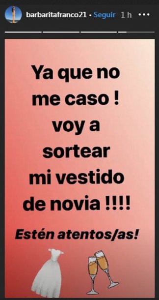 Barby citó la noticia y acotó: “Ya me había comprado el vestido, ¡qué pena! Me casaré con la vida misma”. Más tarde, en Instagram, contó con bombos y platillos que ¡sortearía el vestido de novia! “Ya que no me caso voy a sortear mi vestido de novia, ¡estén atentos!”, adelantó.