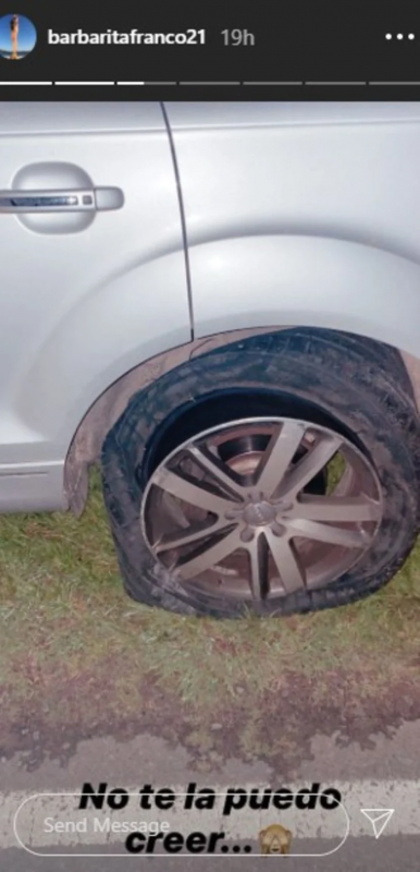 La panelista de “Pampita Online” compartió la imagen de su rueda pinchada y puso “No lo puedo creer“, lamentando lo que le estaba ocurriendo.