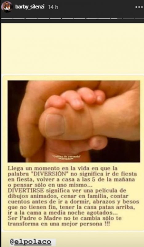 Feliz con la familia que logró formar con el cantante, Barby agregó un mensaje en sus historias: “Llega un momento en la vida en que la palabra ‘diversión’ no significa ir de fiesta en fiesta, volver a casa a las 5 de la mañana o pensar sólo en uno mismo. Divertirse significa ver una película de dibujos animados, cenar en familia, contar cuentos antes de ir a dormir, abrazos y besos que no tienen fin, tener la casa patas para arriba, ir a la cama a medianoche agotados. Ser padre o madre no te cambia, sólo te transforma en una mejor persona“.