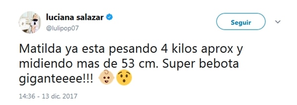 En uno de sus últimos posteos antes del nacimiento, la ex de Martín Redrado contaba asombrada que su hija pesaba casi cuatro kilos y que medía más de 53 centímetros: “Súper bebota gigante”.