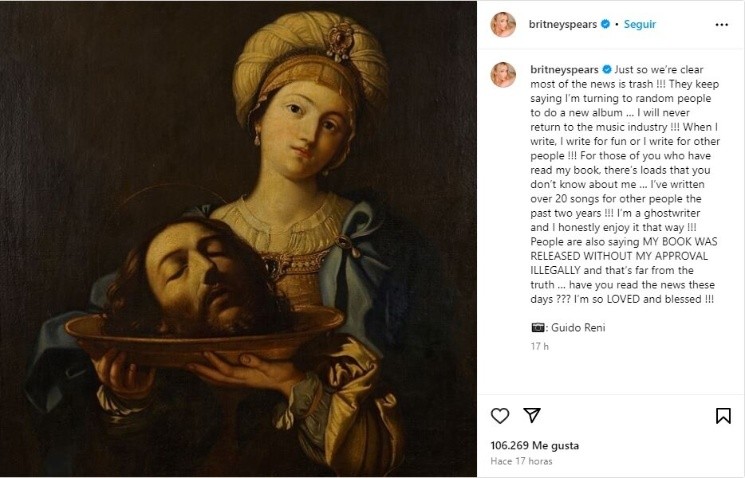 “Solo para que quede claro: la mayoría de las noticias son basura. No paran de decir que estoy recurriendo a gente al azar para hacer un nuevo álbum. ¡Nunca volveré a la industria de la música!”, arrancó diciendo Britney Spears en su descargo publicado en su cuenta de Instagram, que luego cerró.
