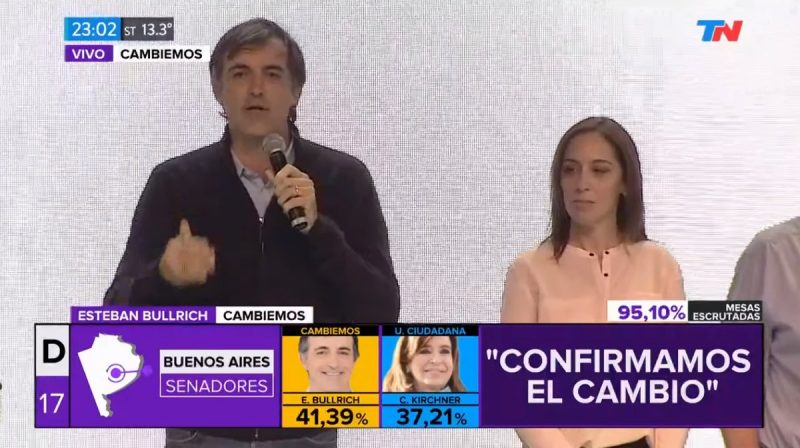 El candidato a senador de Cambiemos por la provincia de Buenos Aires, Esteban Bullrich -que se imponía por el 41,35 % de los votos- afirmó que “hoy dimos un paso para fortalecer nuestra democracia y confirmamos el cambio que ustedes comenzaron en el 2015” y agregó: “Sí, se pudo”, en declaraciones en Costa Salguero donde Cambiemos instaló su búnker.