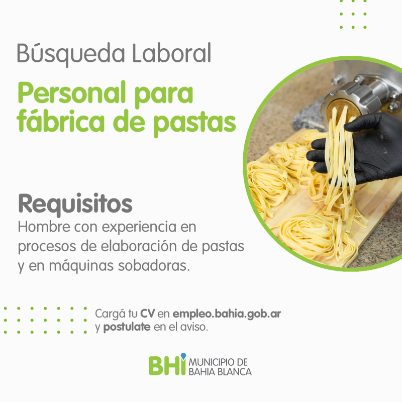 La oficina municipal de Empleo anunció la búsqueda de personal para empresa local dedicada a la fabricación de pastas.