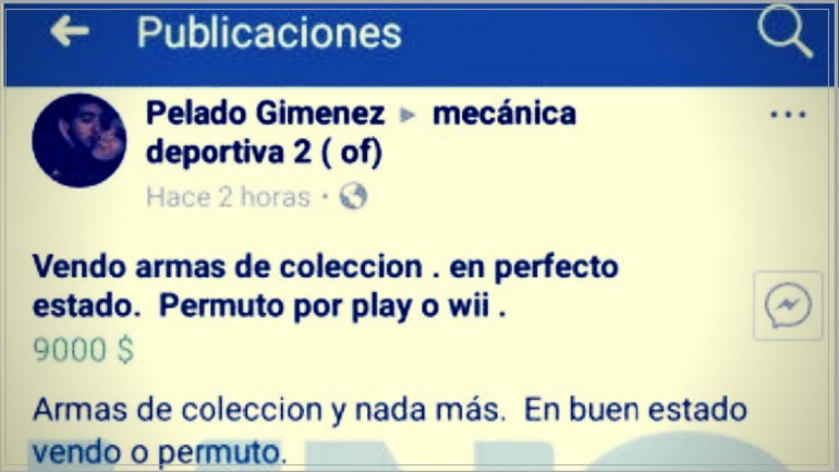 El anuncio fue publicado hace algunos días en un popular grupo de Facebook regional pidiendo nueve mil pesos o una consola de videojuegos. La leyenda era acompañada de dos fotos de los revólveres que se buscaban permutar.