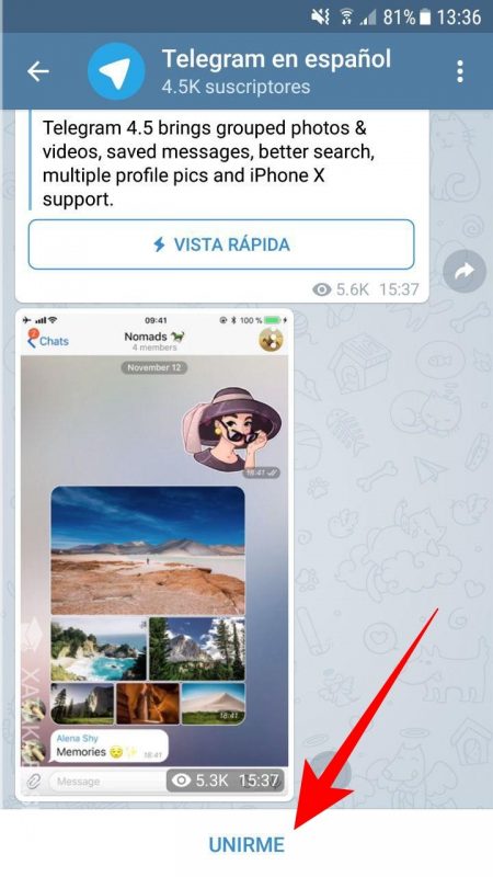 Una vez que pulses sobre el nombre de un canal accederás a él y podrás ver todo lo que se ha publicado hasta ahora. Si lo que ves te gusta, pulsa sobre el botón Unirme y te unirás al canal, de manera que Telegram te notificará cada una de las nuevas publicaciones que publique. Una vez estés dentro tendrás un botón Silenciar por si no quieres notificaciones, pero sí tenerlo siempre a la vista para cuando haya nuevo contenido.