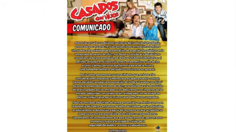 En el mismo, explican que “en base a las consideraciones expuestas y hechos que escapan a nuestro control”, han decidido cancelar la presentación de la obra Casados con hijos durante la temporada de verano del año siguiente, procediéndose a la devolución de las entradas.