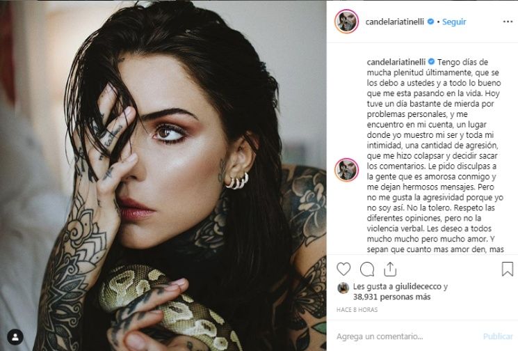 Cande escribió un mensaje para explicar los motivos. “Tengo días de mucha plenitud últimamente, que se los debo a ustedes y a todo lo bueno que me esta pasando en la vida. Hoy tuve un día bastante de mierda por problemas personales, y me encuentro en mi cuenta, un lugar donde yo muestro mi ser y toda mi intimidad, una cantidad de agresión, que me hizo colapsar y decidir sacar los comentarios“, publicó.