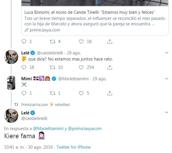 “¿Qué dice? No estamos más juntos hace rato“, escribió tajante en las redes. Y luego lo lapidó: “Quiere fama“.