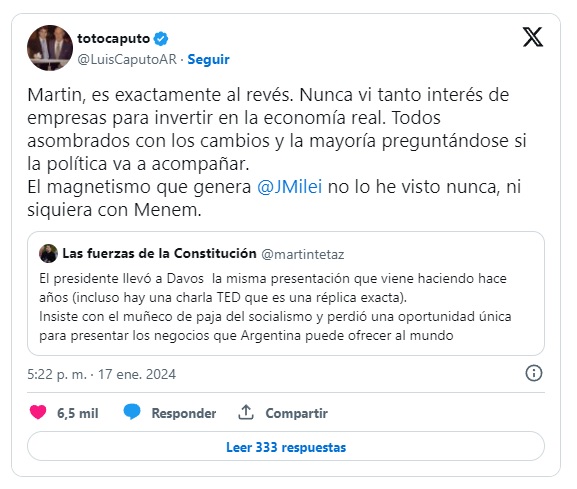 El ministro de Economía, Luis Caputo, mantuvo este miércoles un contrapunto con el diputado radical Martín Tetaz sobre la participación del presidente Javier Milei en el Foro Económico de Davos, en el que el titular del Palacio de Hacienda afirmó que “el magnetismo que genera Milei no lo he visto nunca, ni siquiera con (Carlos) Menem”.
