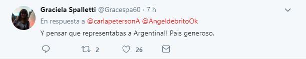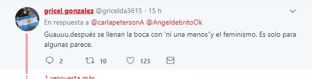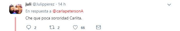 La bronca de Peterson con Michetti tiene que ver con el aborto legal. La actriz es una de las más fervientes defensoras de la aprobación del proyecto, mientras que la funcionaria se expresó en contra en reiteradas oportunidades. Carla no le perdona esto, y así lo hizo saber en otro intercambio de tuits con su colega Verónica Llinás, que también milita del lado verde.