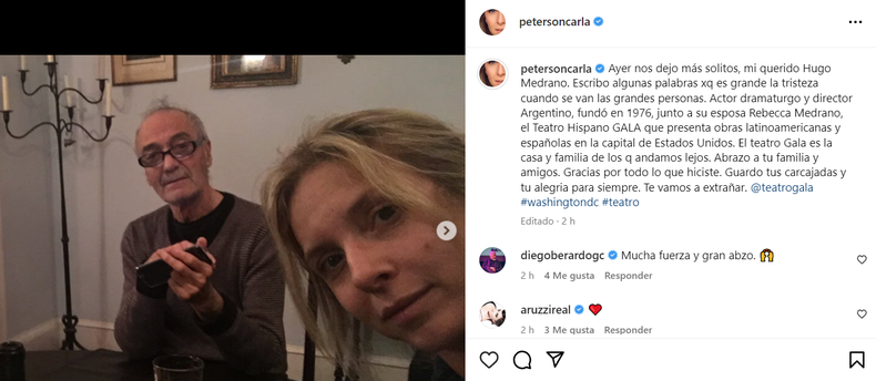 “Ayer nos dejó más solitos, mi querido Hugo Medrano. Actor dramaturgo y director argentino, fundó en 1976, junto a su esposa Rebecca Medrano, el Teatro Hispano GALA que presenta obras latinoamericanas y españolas en la capital de Estados Unidos”, escribió.