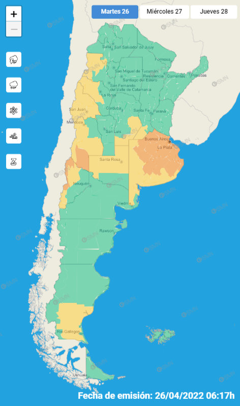También existe una alerta amarilla por vientos para este martes en la zona de Cordillera de las provincias de Neuquén, Mendoza, San Juan, La Rioja y Catamarca, además de en el sur de San Luis, centro y norte de La Pampa y noroeste de la provincia de Buenos Aires.