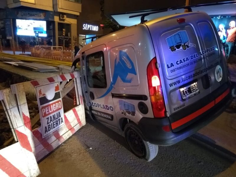 Una camioneta Renault Kangoo (LCC 694), perteneciente a la empresa La Casa del Acomplado, cayó en una zanja de la obra que se esta realizando en el lugar.