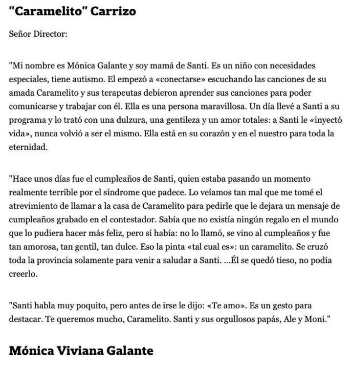 Luego llegó el gesto solidario de Caramelito con Santi, el que motivó a que Mónica decidiera hacer público a través de una carta de lectores.