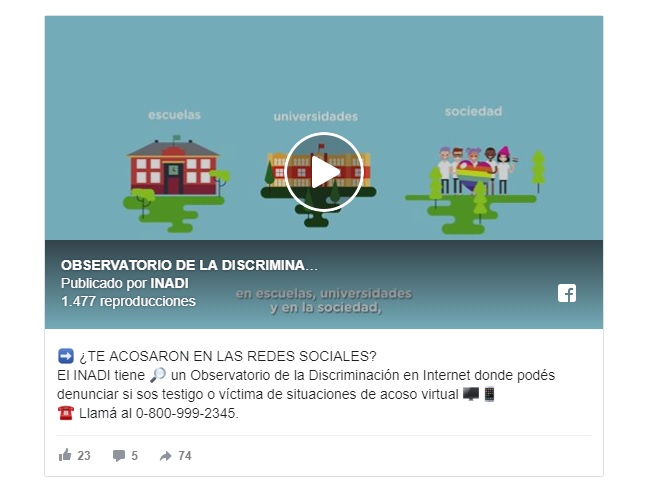 El organismo viene realizando una serie de campañas junto a Unicef contra el ciberbullying. Una de las más recientes fue durante el último festival Lollapalooza en el que se invitó a los jóvenes “a tomar conciencia sobre la responsabilidad de construir una internet libre de discriminación”. En este tipo de iniciativas, los adolescentes se asesoran sobre el ciberbullying y participan de iniciativas como la campaña “#NoDaCompartir”. “Esta es una oportunidad de acercarnos a los chicos, que son el futuro, para trabajar juntos para prevenir la discriminación digital y reflexionar sobre la llegada que permiten los medios y las consecuencias en la vida real que sufre una persona que está siendo víctima de acoso”, dijo Claudio Presman, titular del Inadi.