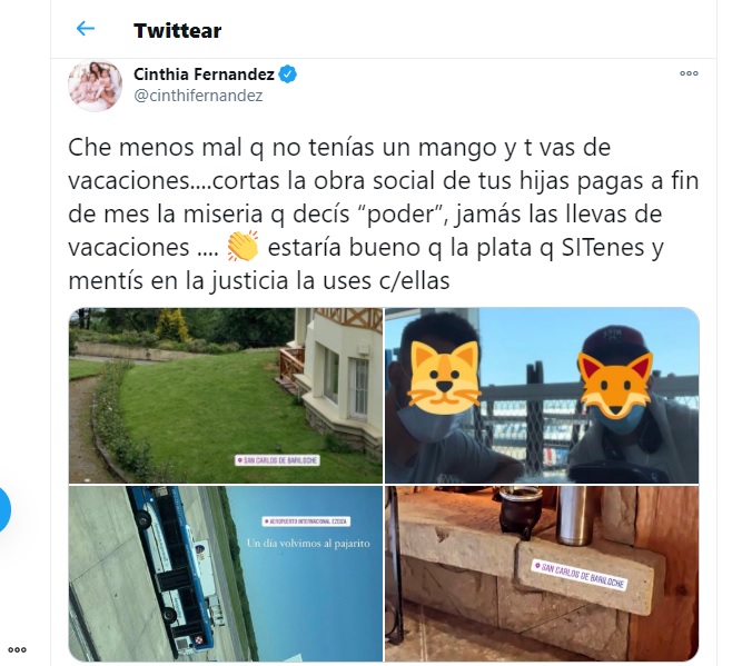 Y siguió: “Cortas la obra social de tus hijas pagas a fin de mes la miseria q decís “poder”, jamás las llevas de vacaciones… estaría bueno q la plata q si tenes y mentís en la justicia la uses c/ellas“.