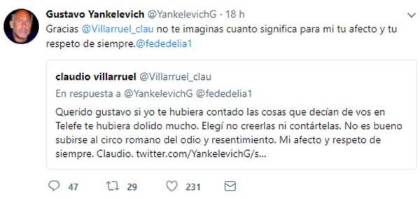 Villarruel le respondió a Yankelevich por la misma vía con un fuerte mensaje:”Querido Gustavo, si yo te hubiera contado las cosas que decían de vos en Telefe te hubiera dolido mucho. Elegí no creerlas ni contártelas. No es bueno subirse al circo romano del odio y resentimiento. Mi afecto y respeto de siempre. Claudio”.