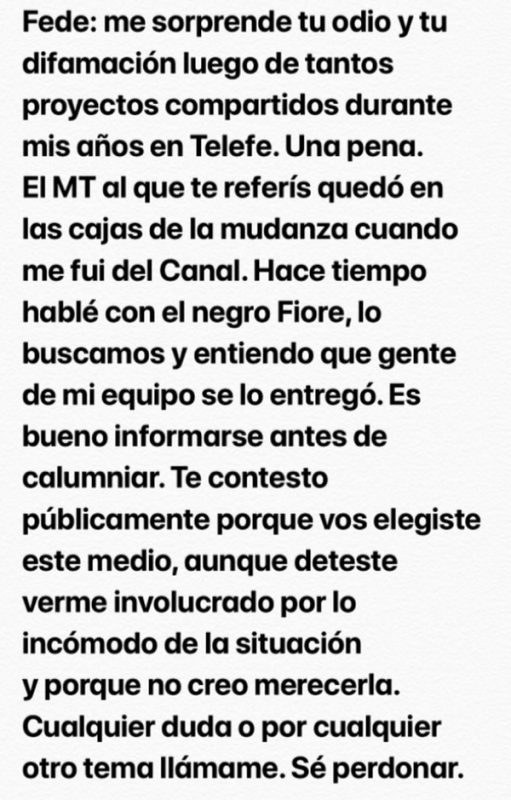 “Fede: me sorprende tu odio y tu difamación luego de tantos proyectos compartidos durante mis años en Telefe. Una pena. El MT al que te referís quedó en las cajas de mudanza cuando me fui del canal. Hace tiempo hablé con el negro Fiore, lo buscamos y entiendo que gente de mi equipo se lo entregó. Es bueno informarse antes de calumniar. Te contesto públicamente porque vos elegiste este medio, aunque deteste verme involucrado por lo incómodo de la situación y porque no creo merecerla. Cualquiera duda o por cualquier otro tema llámame. Sé perdonar”, concluye el extenso escrito publicado por el ex gerente artístico de Telefe.