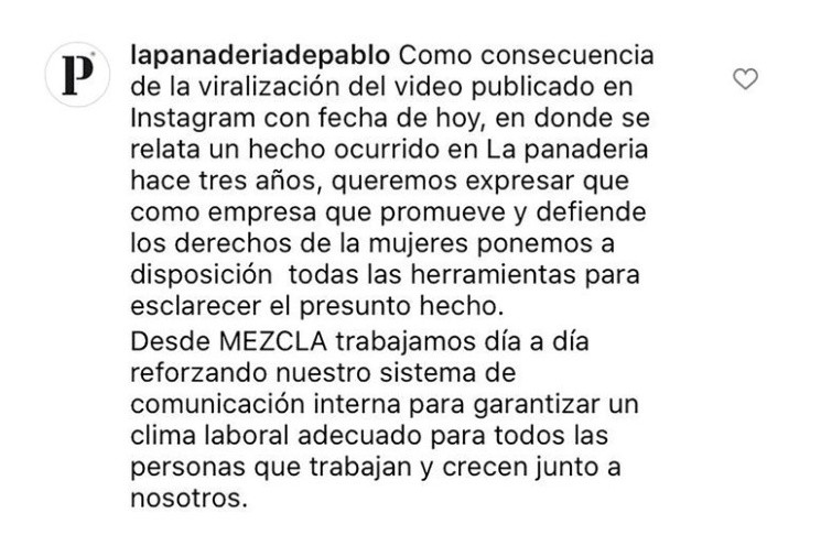 En paralelo, la Panadería de Pablo, establecimiento donde habría ocurrido el acoso de Massey contra Trinidad, emitieron un comunicado al respecto: “Como consecuencia del video publicado en el día de hoy, en referencia a un hecho ocurrido hace tres años, queremos expresar que como empresa que promueve y defiende los derechos de las mujeres ponemos a disposición todas las herramientas para esclarecer el presunto hecho. Trabajamos día a día reforzando nuestra comunicación interna para garantizar un clima laboral adecuado para todas las personas que trabajan y crecen junto a nosotros”.